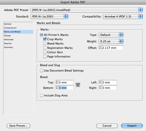 Scroll down to the 'Marks and Bleeds' menu.