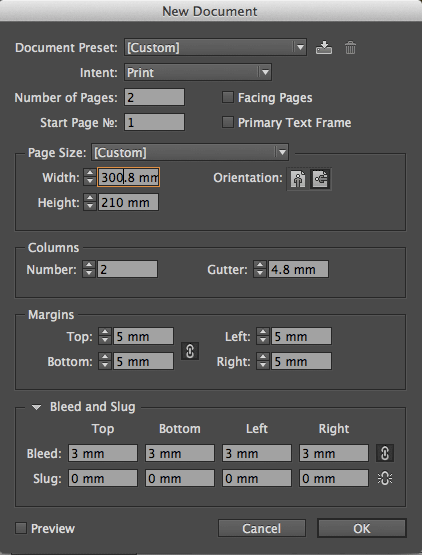 Add '3mm' in the top, bottom, left and right boxes here to add a border on your InDesign artwork 3mm outside the page edge to guide you where the bleed needs to extend to. For further information on bleed see the Bleed set up section.