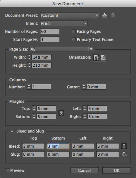 Adding '3mm' in the top, bottom, left and right boxes here will add a red border on your InDesign artwork 3mm outside of the blank page edge to show where the bleed needs to extend to. For further info see the Bleed set up section above.